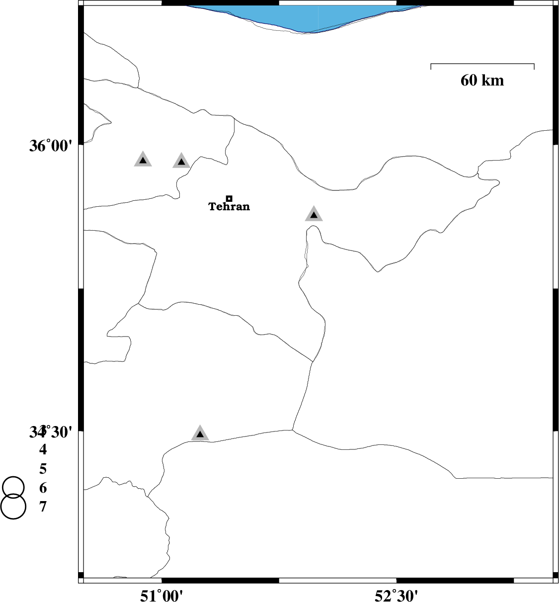 | 2007/07/04 | 09:25:54.9 | 12:55:54.9 | 36.38 | 51.33 | 15 | ML:2.5 | 31 km South of Chalus, Mazandaran Province |