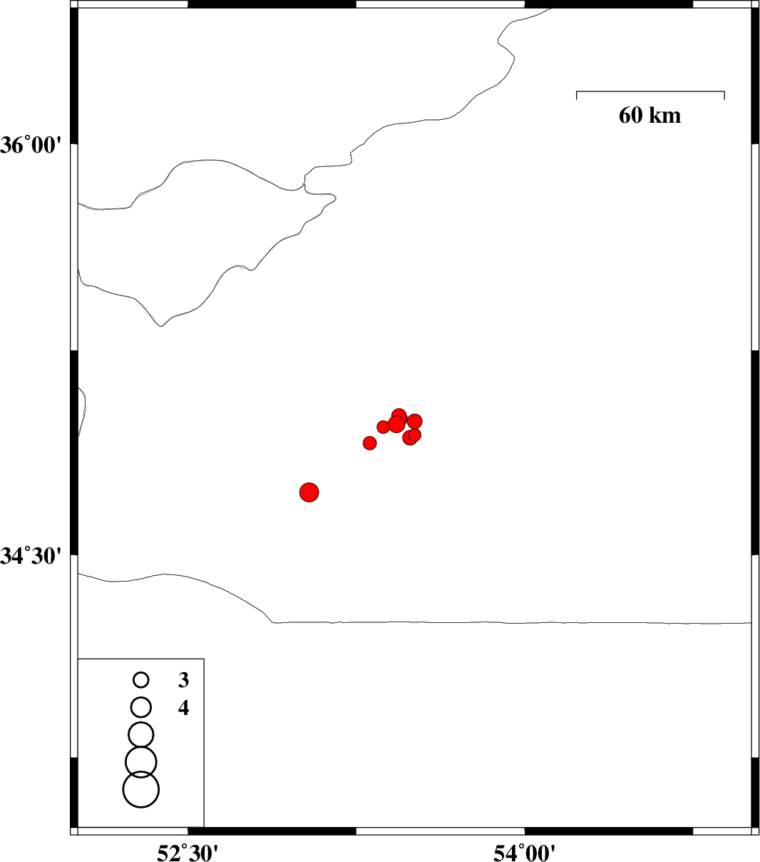 | 2007/09/05 | 14:02:47.7 | 17:32:47.7 | 34.93 | 53.49 | 14 | ML:3 | 71 km South of Semnan, Semnan Province |