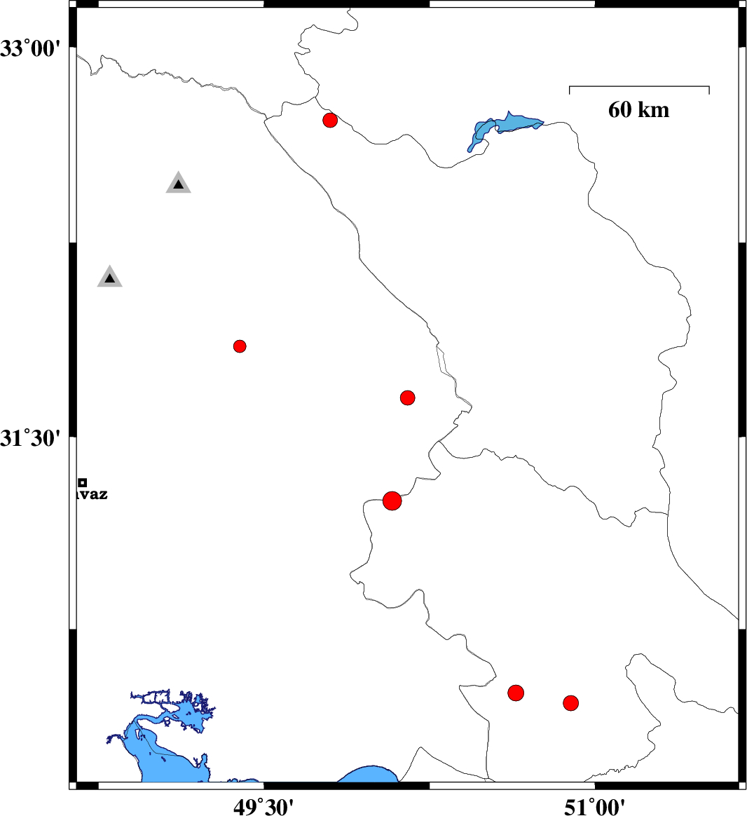 | 2007/06/17 | 20:17:51.1 | 23:47:51.1 | 31.85 | 49.39 | 45 | ML:2.6 | 11 km Masjed Soleyman, Khoozestan Province | ||