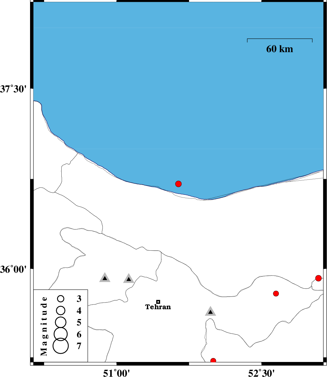 | 2007/07/13 | 01:53:35.1 | 05:23:35.1 | 36.71 | 51.64 | 15 | ML:2.8 | Caspian Sea, 14 km East of Nowshahr | ||