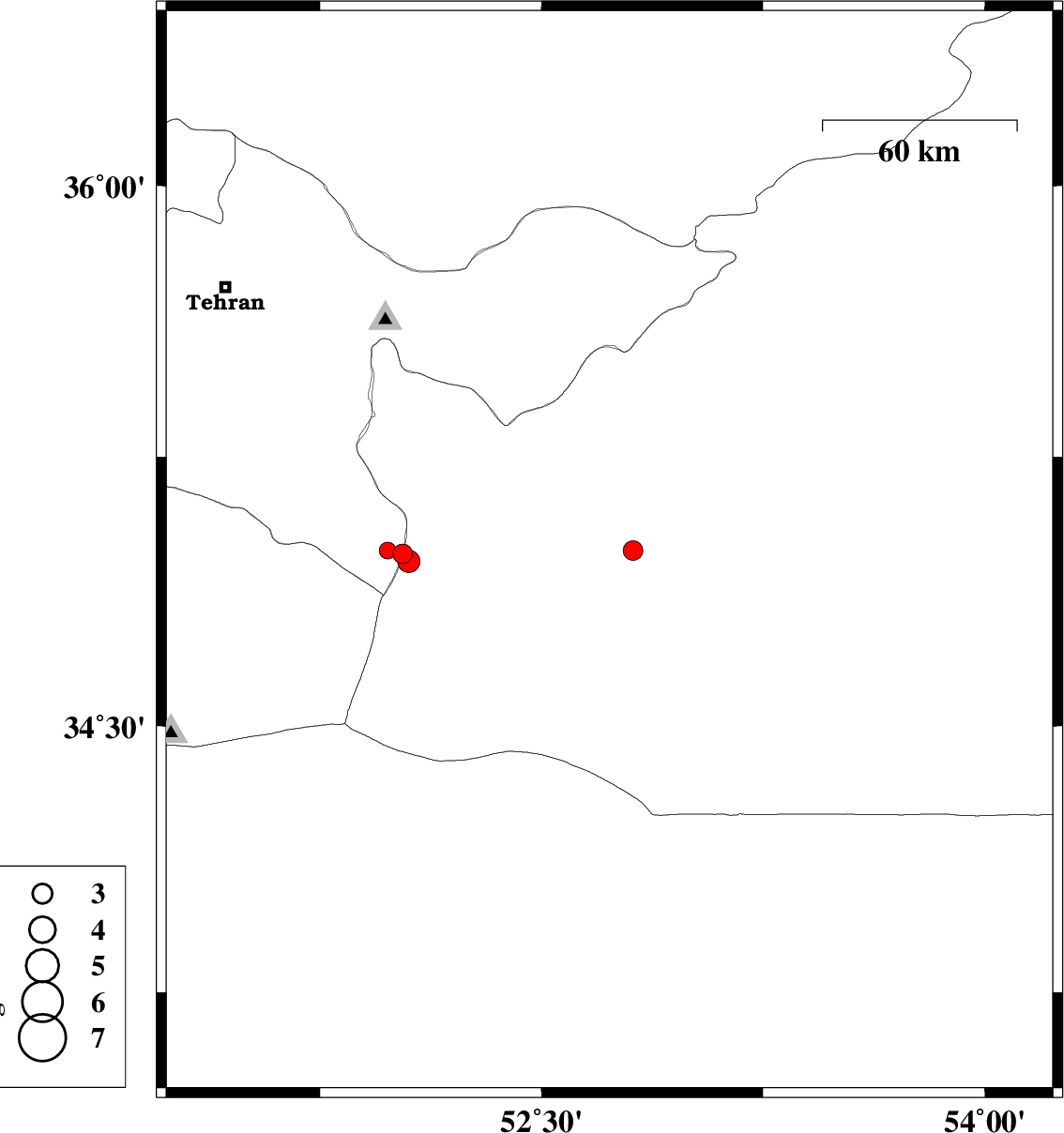 | 2007/09/19 | 06:02:33.1 | 09:32:33.1 | 34.99 | 52.68 | 15 | ML:2.5 | 40 km South-East of Garmsar, Semnan Province | ||