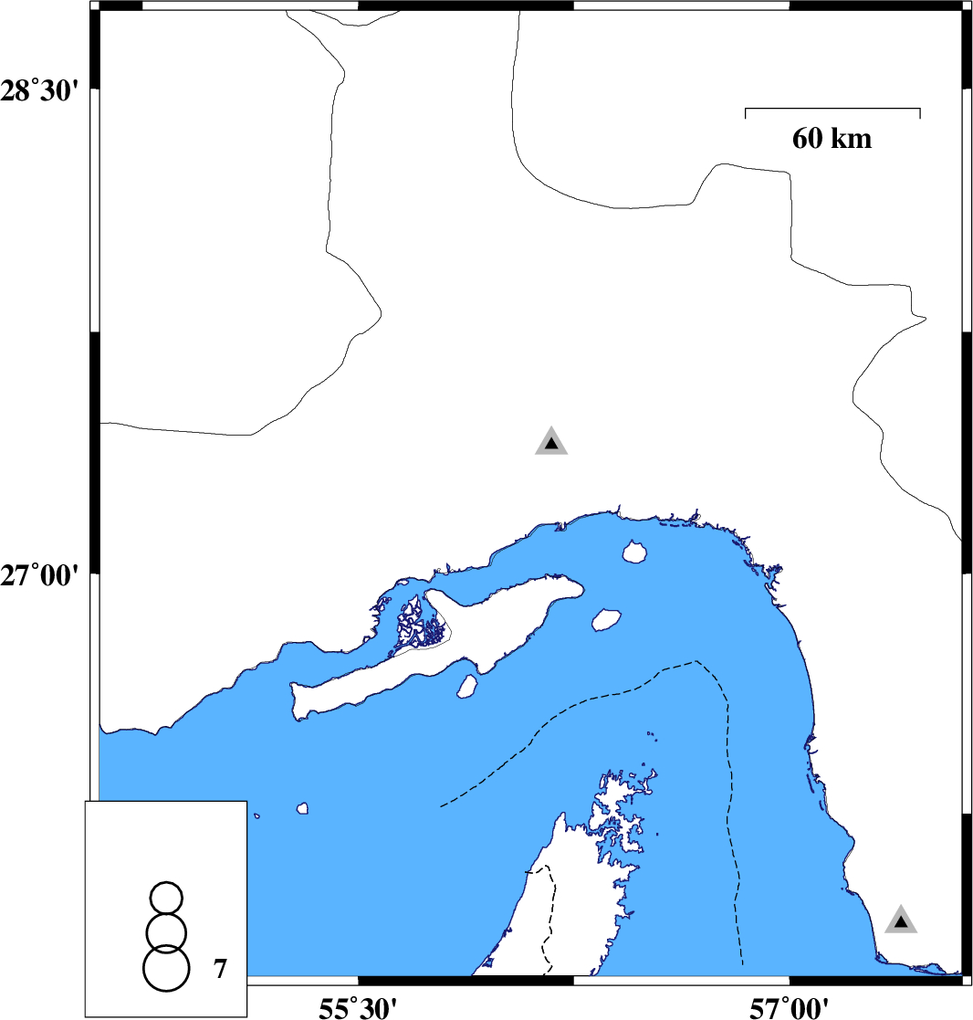 | 2007/09/23 | 21:06:07.6 | 00:36:07.6 | 27.24 | 56.1 | 41 | ML:3.2 | 18 km West of Bandar-e abbas, Hormozgan Province |