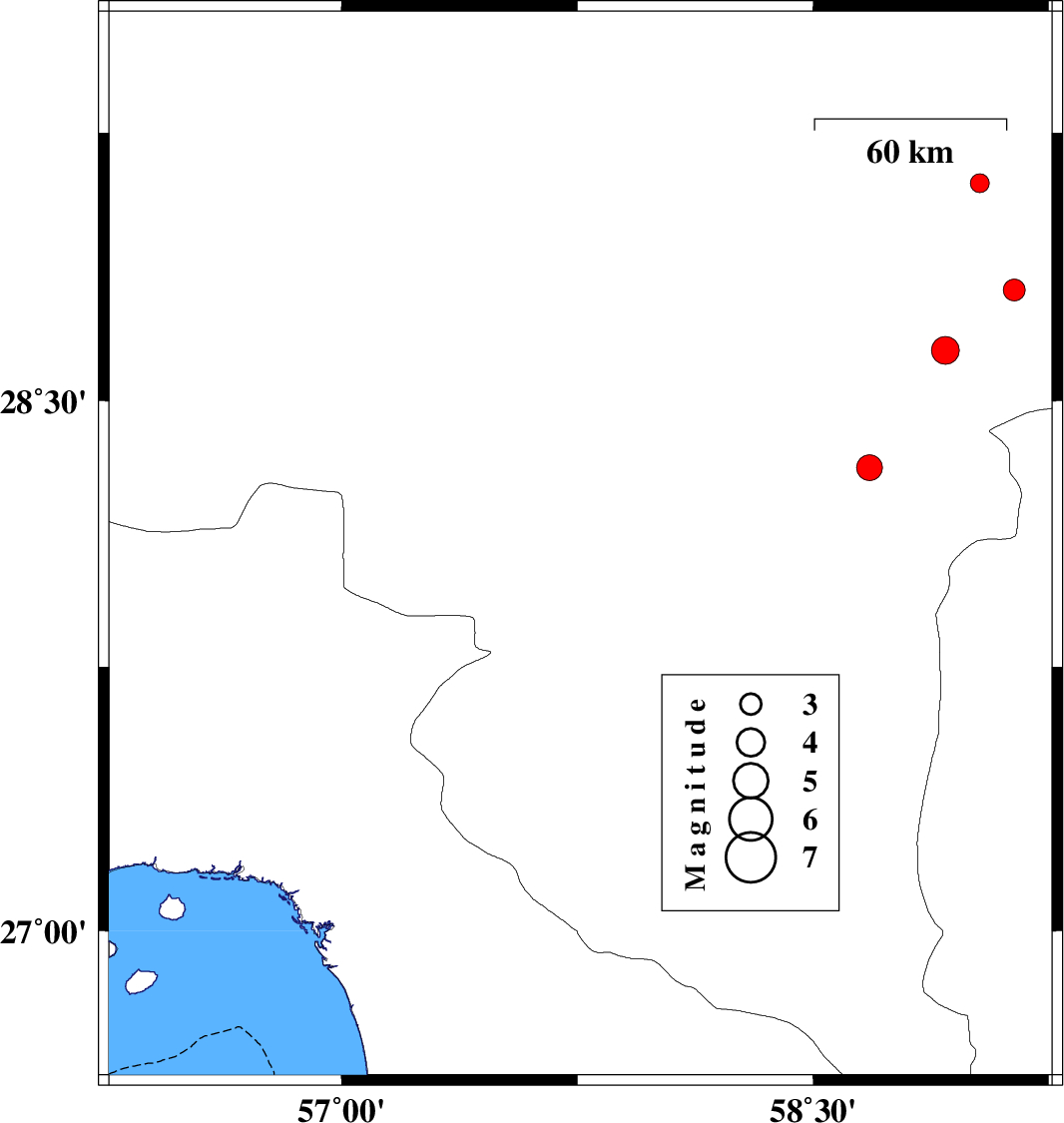 | 2007/07/16 | 17:25:51.2 | 20:55:51.2 | 28.18 | 57.16 | 28 | ML:4 | 58 km North-West of Kahnuj, Kerman Province | ||
