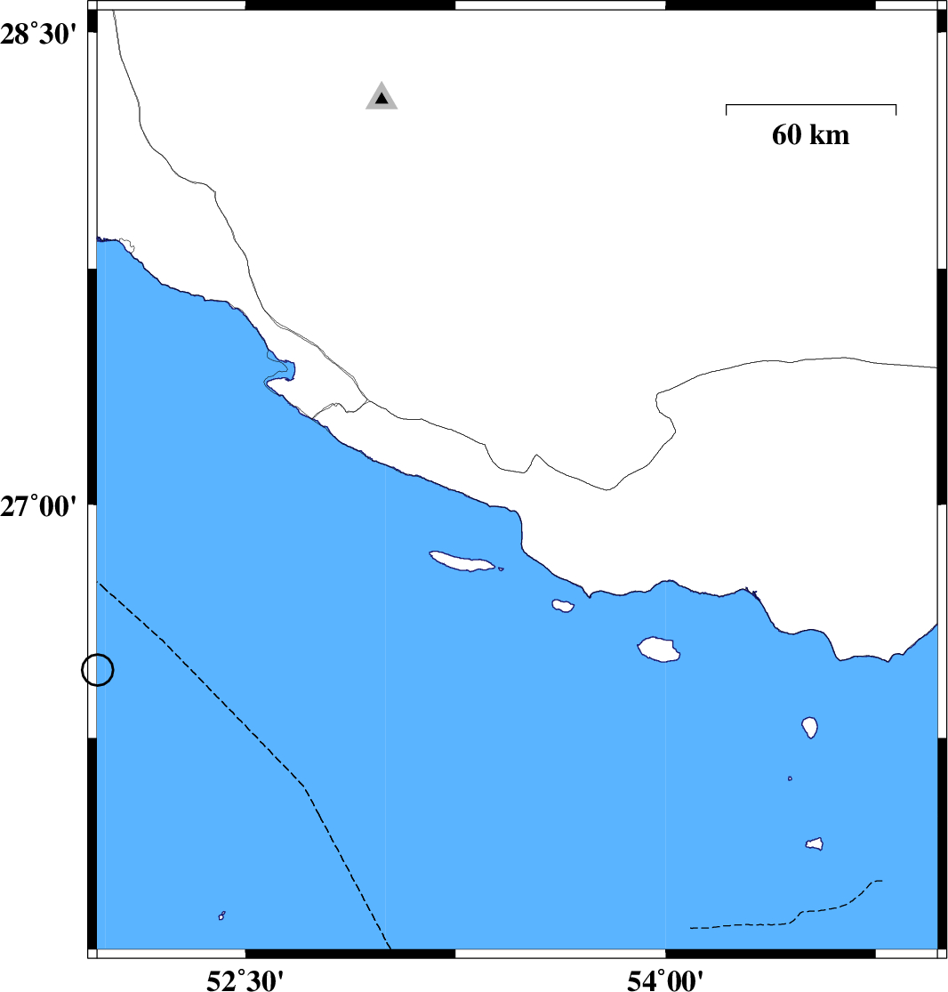 | 2007/10/06 | 15:22:34.5 | 18:52:34.5 | 26.54 | 53.75 | 18 | ML:3.2 | Persian Gulf, 94 km South-West of Bastak | ||