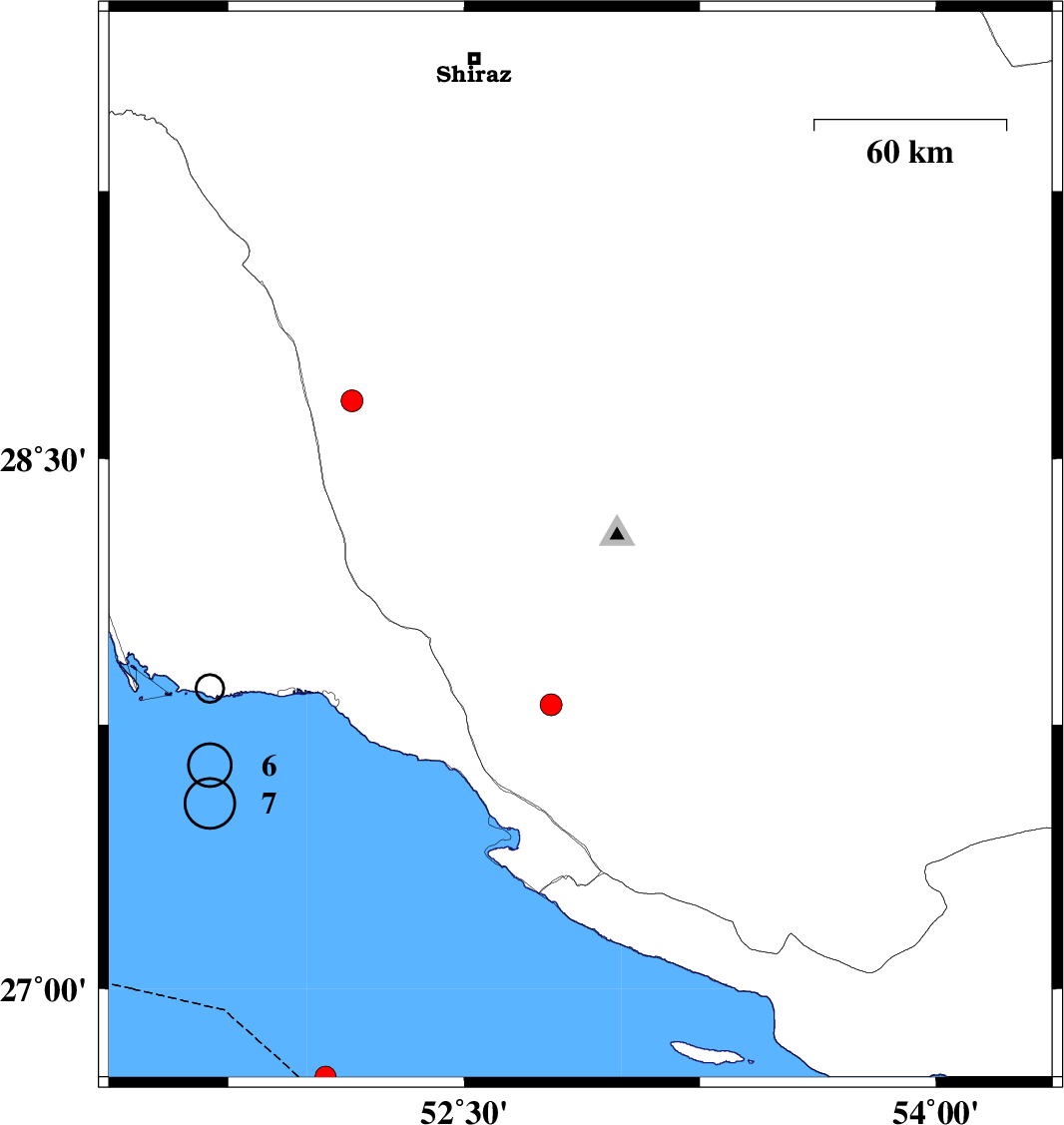 | 2007/09/18 | 04:38:54.2 | 08:08:54.2 | 26.89 | 54.36 | 35 | ML:2.9 | 34 km South of Bastak, Hormozgan Province |