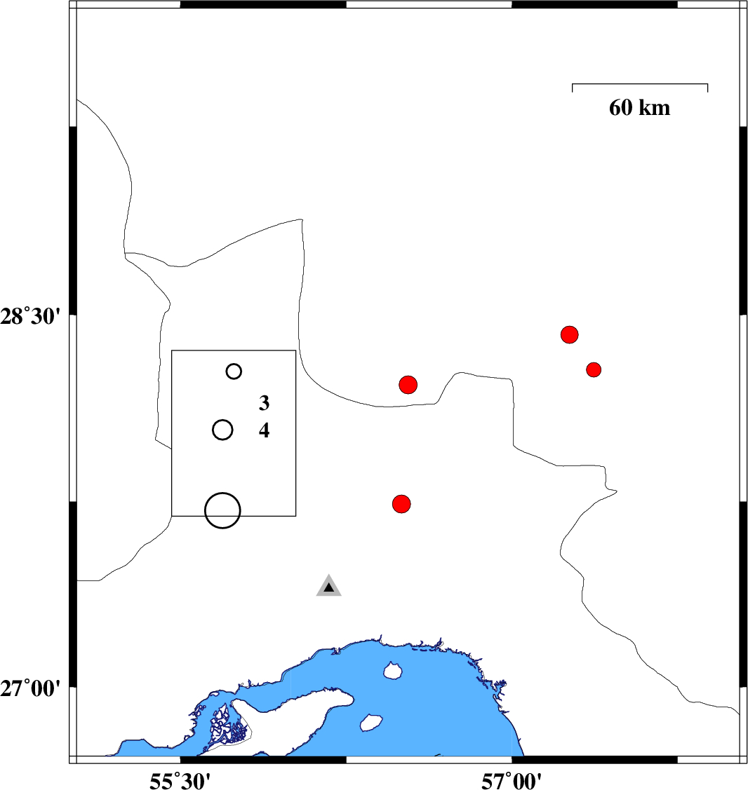 | 2007/10/15 | 00:19:01.4 | 03:49:01.4 | 28.28 | 57.37 | 36 | ML:2.9 | 48 km North-West of Kahnuj, Kerman Province | ||