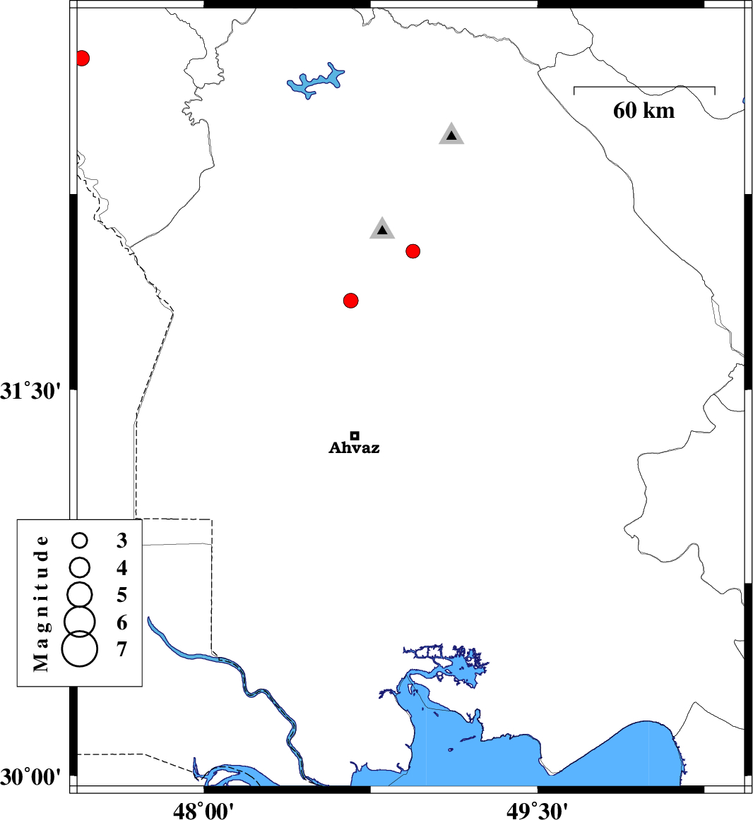 | 2007/10/20 | 03:11:23.0 | 06:41:23.0 | 31.46 | 48.93 | 10 | ML:3 | 28 km North-East of Ahvaz, Khoozestan Province | ||