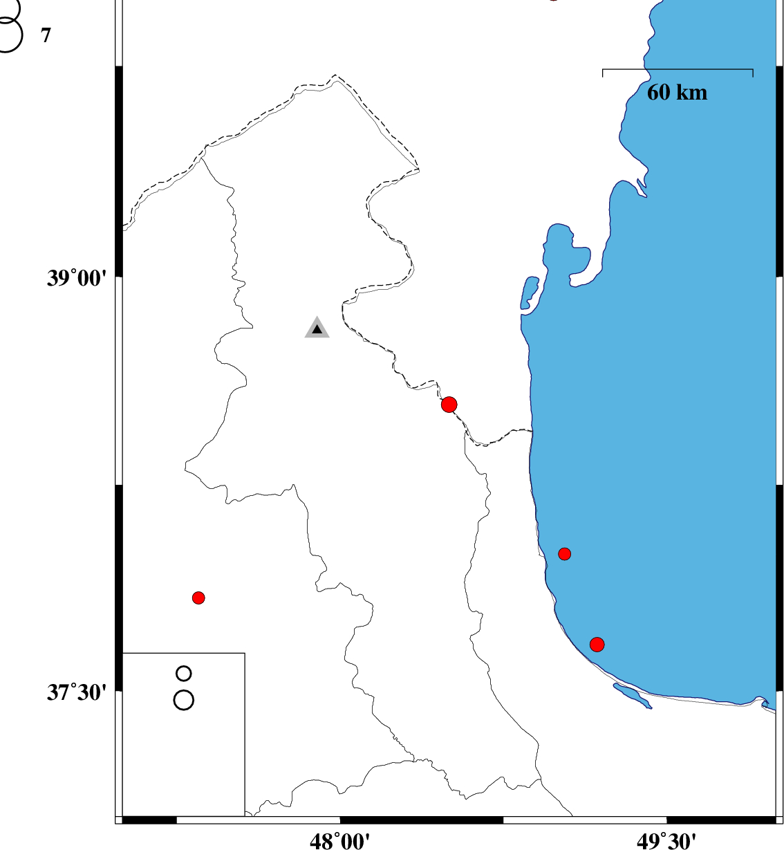 | 2007/10/24 | 07:57:17.7 | 11:27:17.7 | 37.67 | 49.18 | 18 | ML:2.9 | Caspian Sea, 13 km North of Rezvanshahr | ||