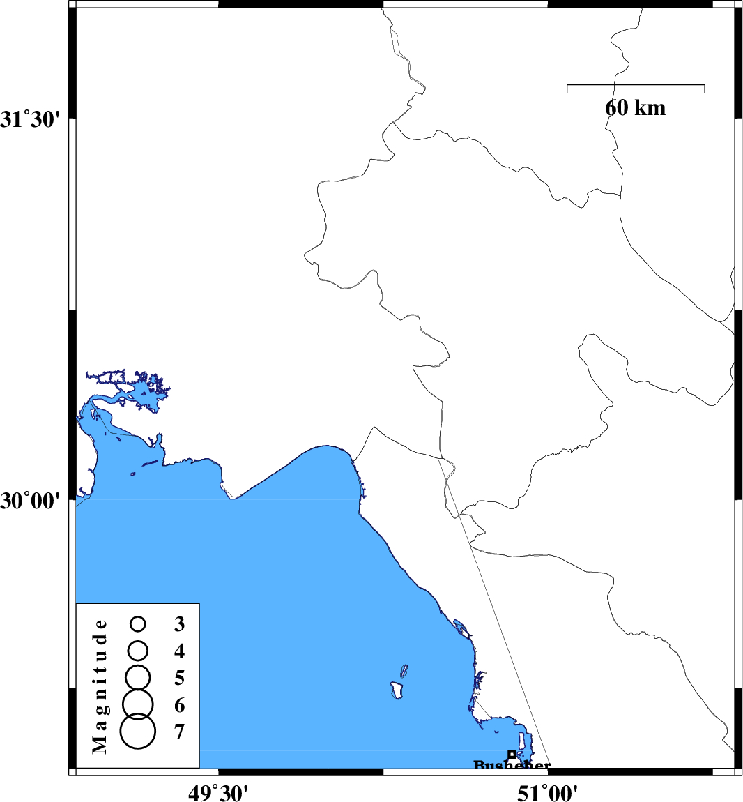 | 2007/11/15 | 01:04:00.5 | 04:34:00.5 | 30.43 | 50.35 | 14 | ML:2.8 | 21 km South-East of Behbahan, Khoozestan Province |