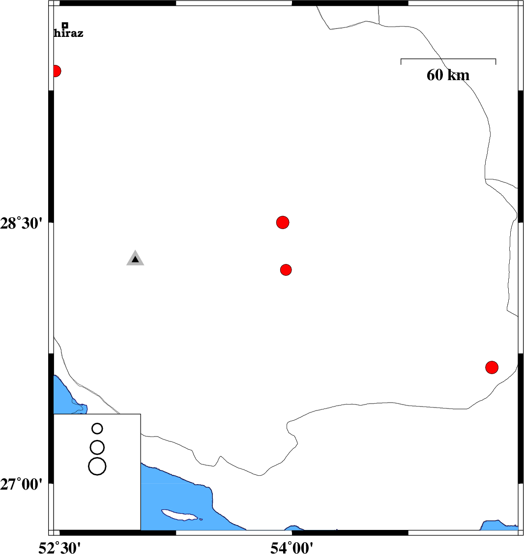 | 2007/11/15 | 02:37:41.1 | 06:07:41.1 | 29.36 | 52.47 | 46 | ML:3.4 | 29 km South of Shiraz, Fars Province | ||