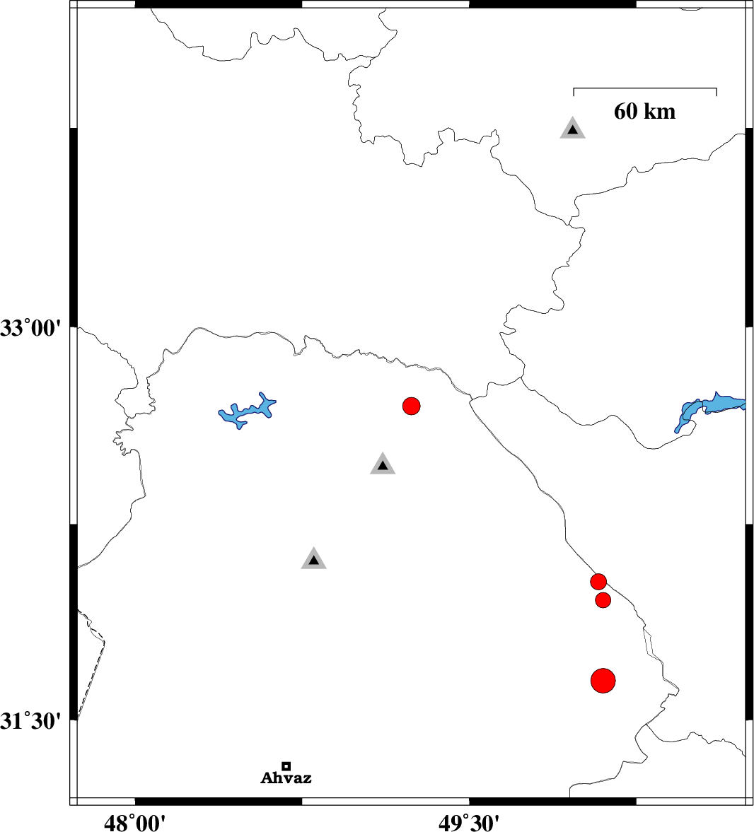 | 2007/11/20 | 05:20:02.8 | 08:50:02.8 | 31.65 | 50.1 | 17 | ML:4.9 | 24 km North-East of Bagh Malek, Khoozestan Province |