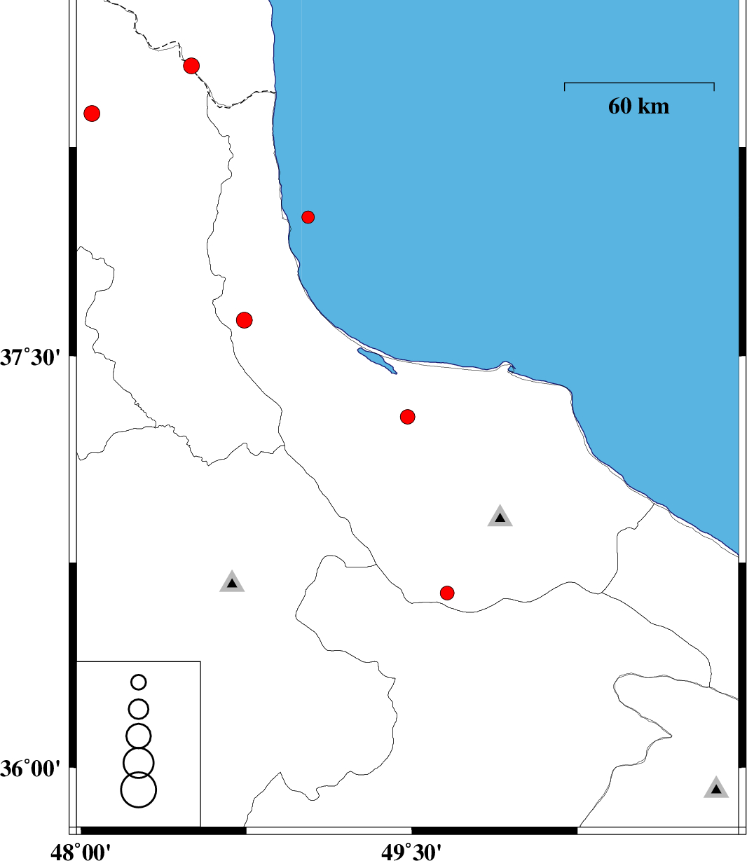 | 2007/11/05 | 22:14:41.3 | 01:44:41.3 | 38 | 49.03 | 18 | ML:2.6 | Caspian Sea, 24 km North-East of Hashtpar |