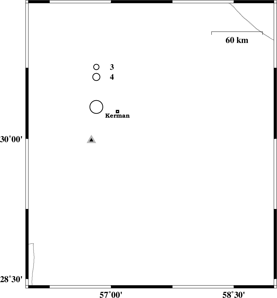 | 2007/12/13 | 01:05:05.1 | 04:35:05.1 | 29.93 | 57.49 | 15 | ML:2.9 | 55 km South-East of Kerman, Kerman Province | ||