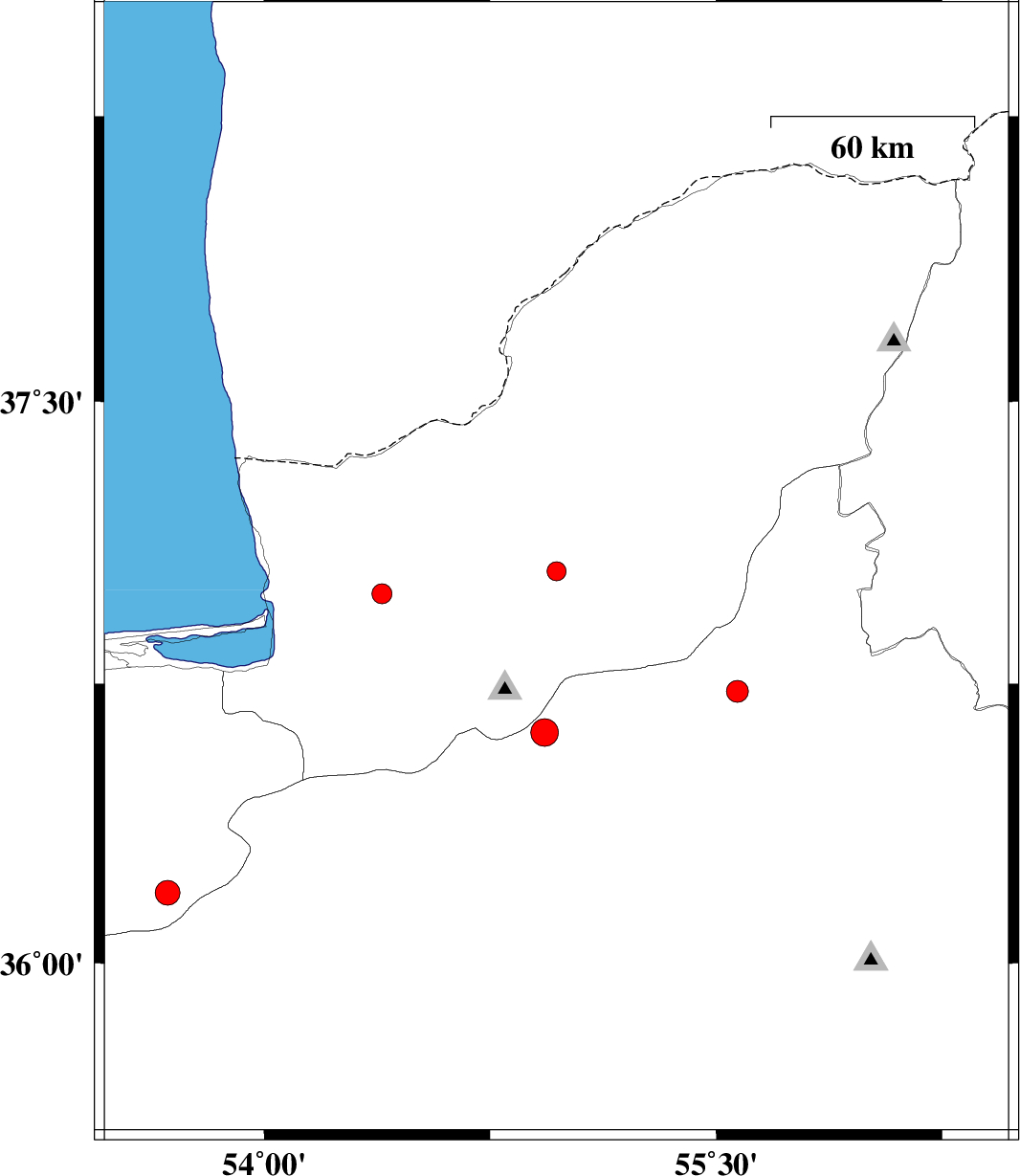 | 2007/12/12 | 02:52:45.3 | 06:22:45.3 | 36.19 | 53.68 | 14 | ML:3.6 | 56 km East of Pol-E-Sefid, Mazandaran Province | ||