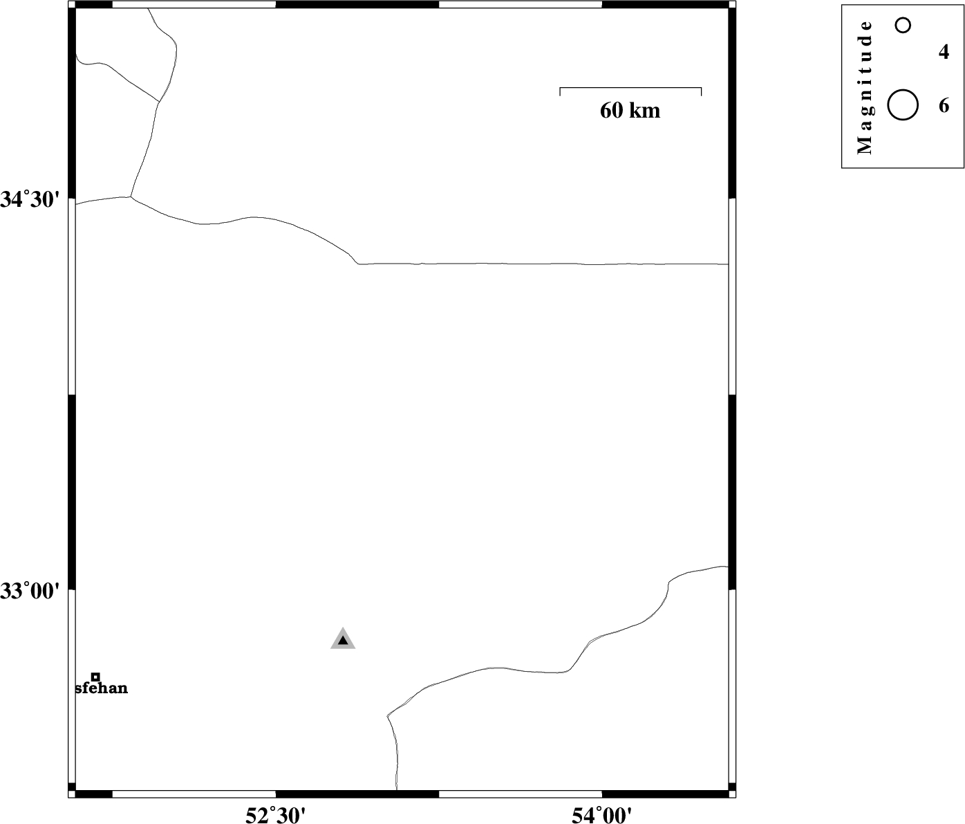 | 2008/01/09 | 09:54:49.4 | 13:24:49.4 | 33.72 | 53.08 | 14 | ML:3 | 75 km North-East of Ardestan, Esfahan Province | ||