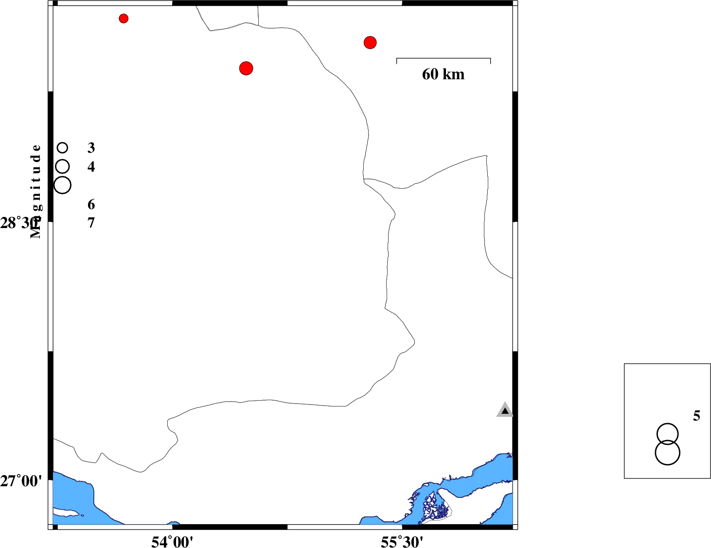 | 2008/01/05 | 00:37:47.2 | 04:07:47.2 | 27.79 | 54.7 | 14 | ML:4 | 37 km North-East of Lar, Fars Province | ||