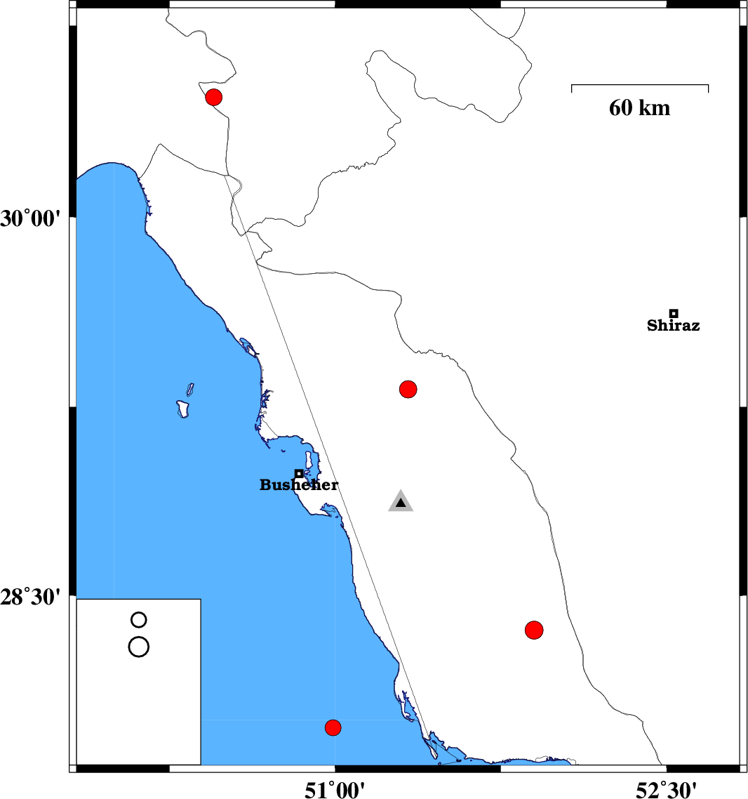 | 2008/01/13 | 14:30:44.7 | 18:00:44.7 | 29.32 | 51.33 | 18 | ML:3.5 | 13 km East of Borazjan, Bushehr Province | ||