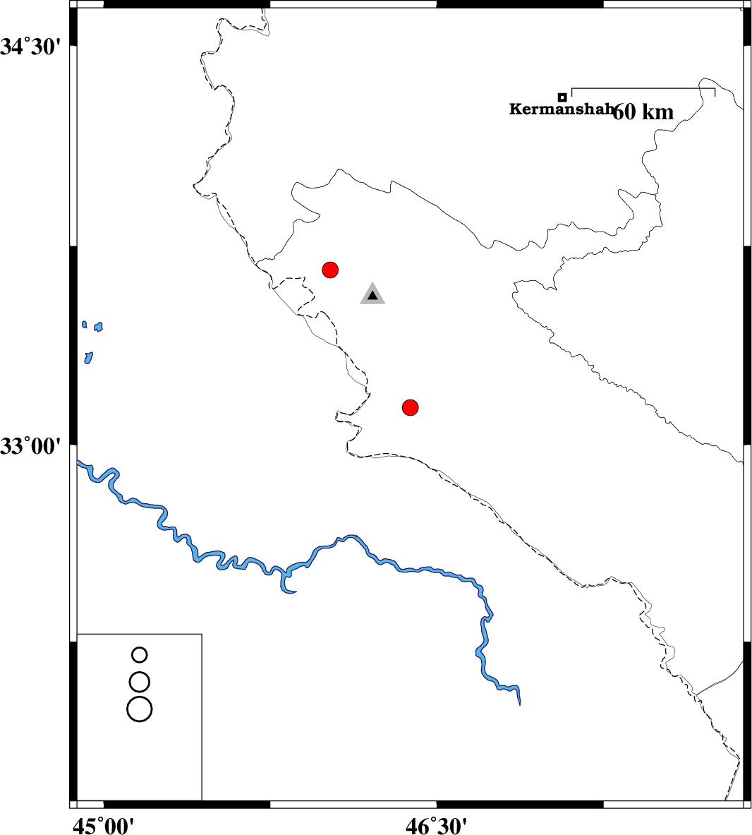 | 2008/01/09 | 00:46:08.5 | 04:16:08.5 | 33.66 | 46.02 | 18 | ML:3.3 | 32 km South-West of Eyvan, Ilam Province |