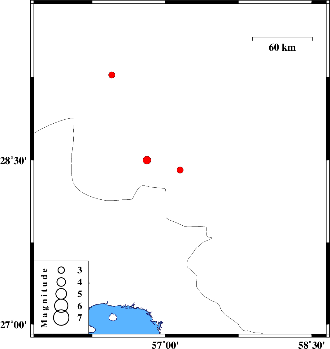 | 2008/01/27 | 17:00:25.1 | 20:30:25.1 | 29.27 | 56.45 | 16 | ML:3 | 16 km West of Baft, Kerman Province |