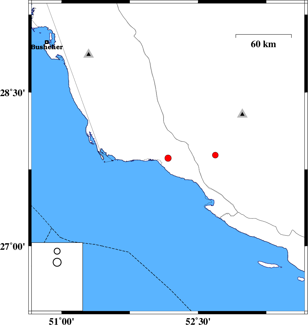 | 2008/03/07 | 20:27:00.5 | 23:57:00.5 | 27.86 | 52.17 | 19 | ML:3.2 | 11 km East of Bandar-e kangan, Bushehr Province | ||