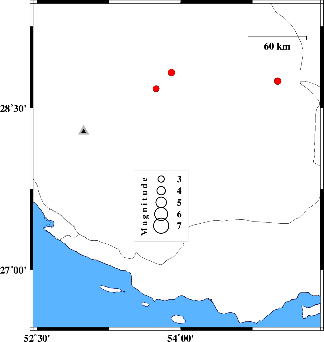 | 2008/03/07 | 05:54:11.1 | 09:24:11.1 | 27.89 | 52.69 | 0 | ML:3 | 37 km East of Jam, Bushehr Province | ||