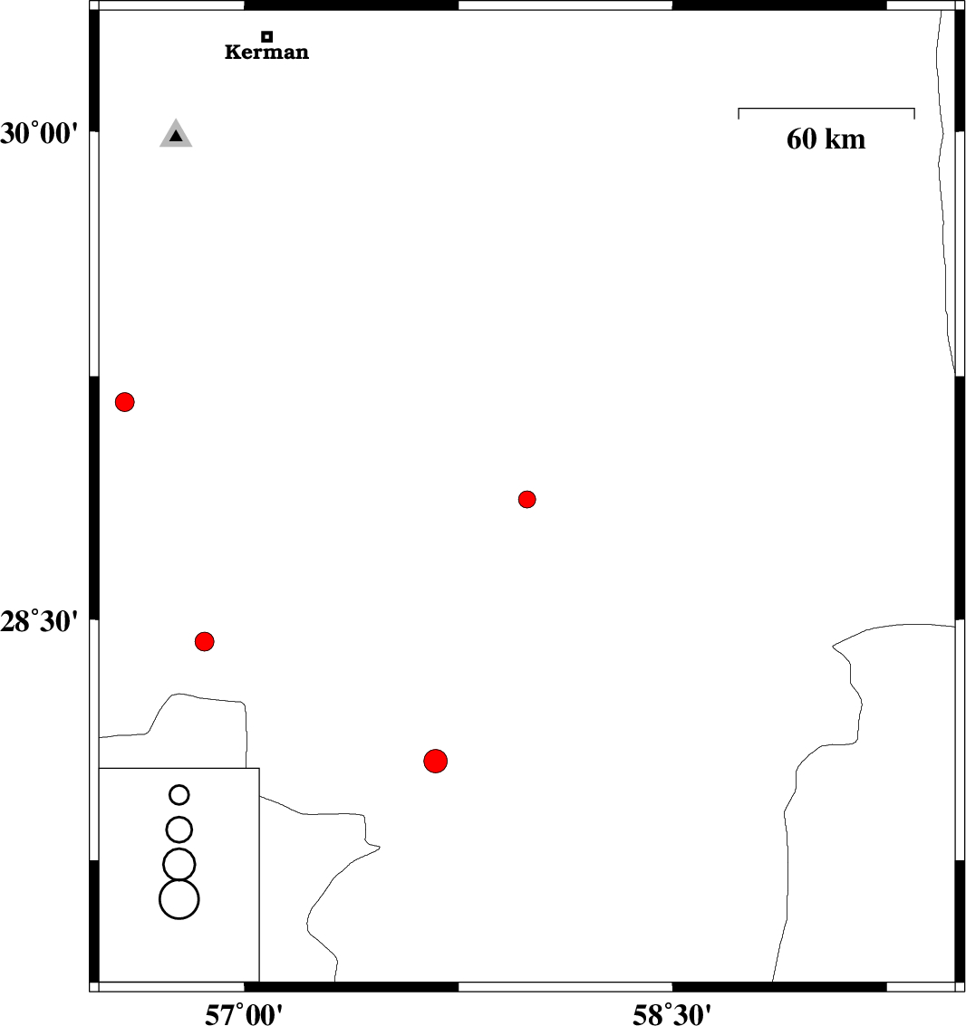 | 2008/04/13 | 12:40:05.0 | 17:10:05.0 | 28.06 | 57.67 | 14 | ML:3.7 | 12 km North of Kahnuj, Kerman Province | ||