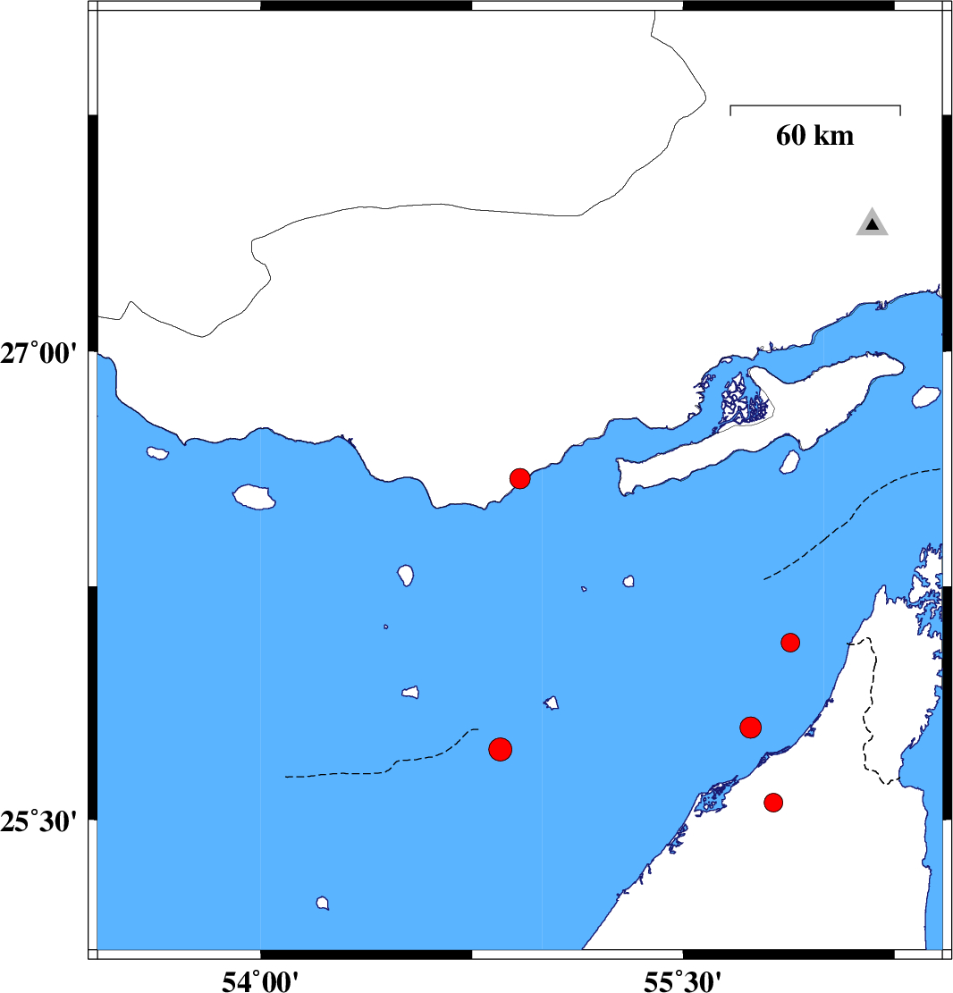 | 2008/03/26 | 07:09:39.1 | 11:39:39.1 | 27.77 | 55.77 | 14 | ML:3.5 | 61 km South-West of Hajiabad, Hormozgan Province |