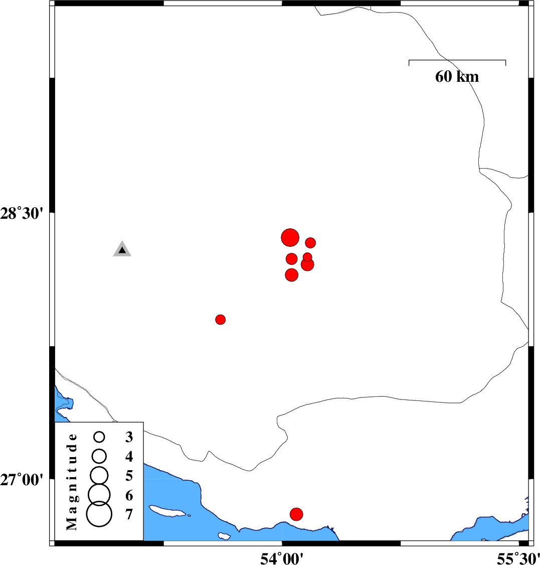| 2008/05/06 | 05:26:21.3 | 09:56:21.3 | 28.33 | 54.18 | 14 | ML:2.9 | 58 km South-West of Darab, Fars Province | ||