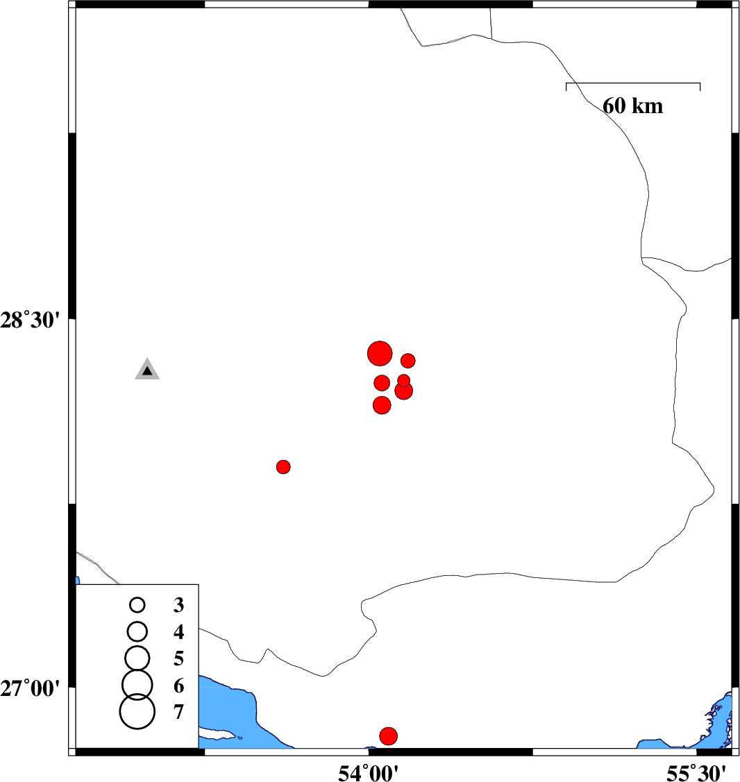 | 2008/05/06 | 05:26:21.3 | 09:56:21.3 | 28.33 | 54.18 | 14 | ML:2.9 | 58 km South-West of Darab, Fars Province | ||