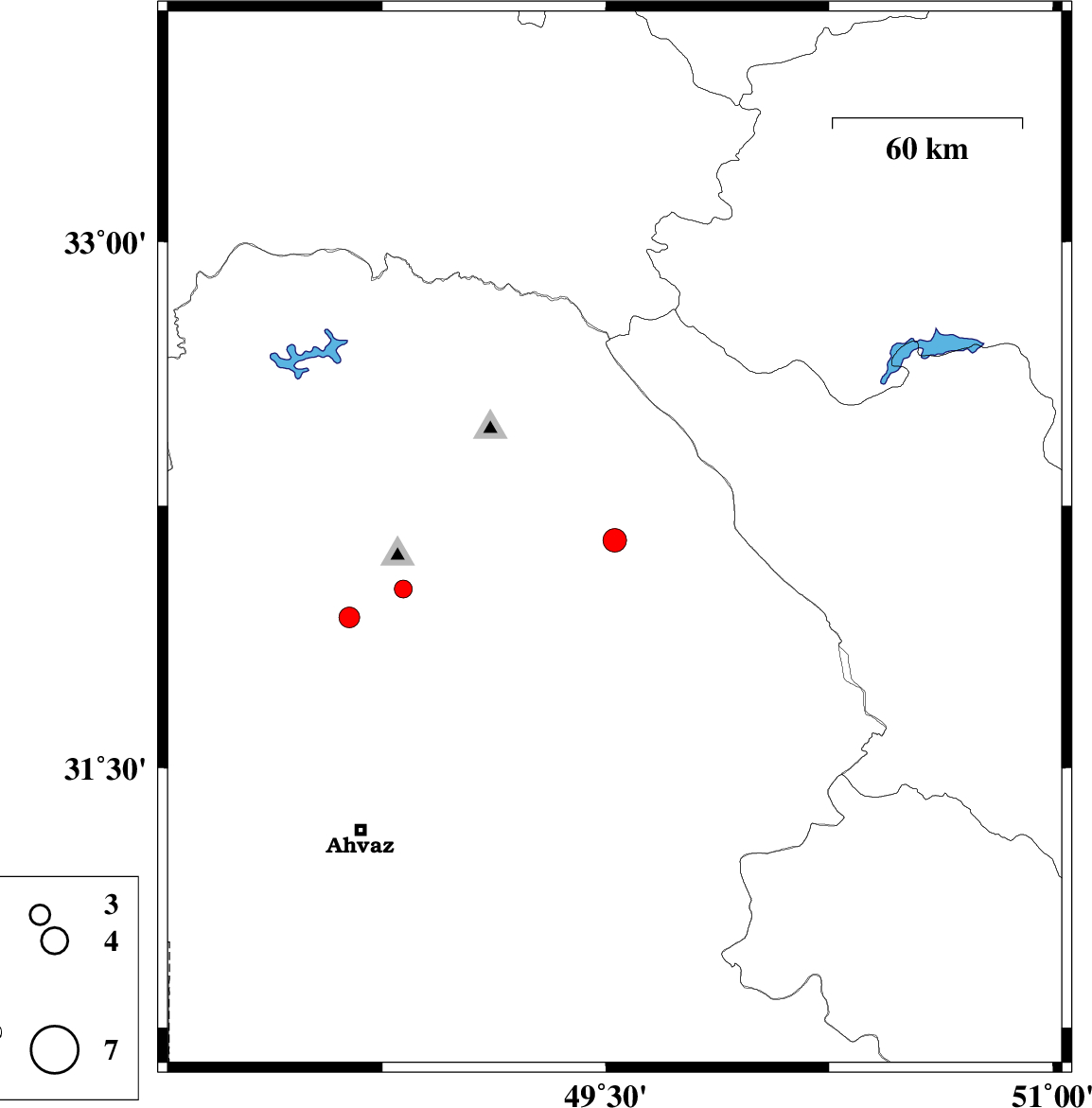 | 2008/05/15 | 04:28:56.8 | 08:58:56.8 | 32.07 | 49.35 | 36 | ML:3.1 | 16 km North of Masjed Soleyman, Khoozestan Province |