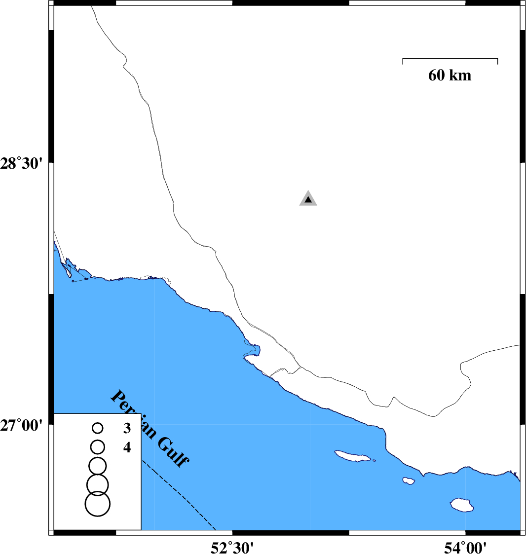 | 2008/05/22 | 20:55:58.9 | 01:25:58.9 | 27.89 | 52.85 | 12 | ML:3 | 38 km North of Mehr, Fars Province |