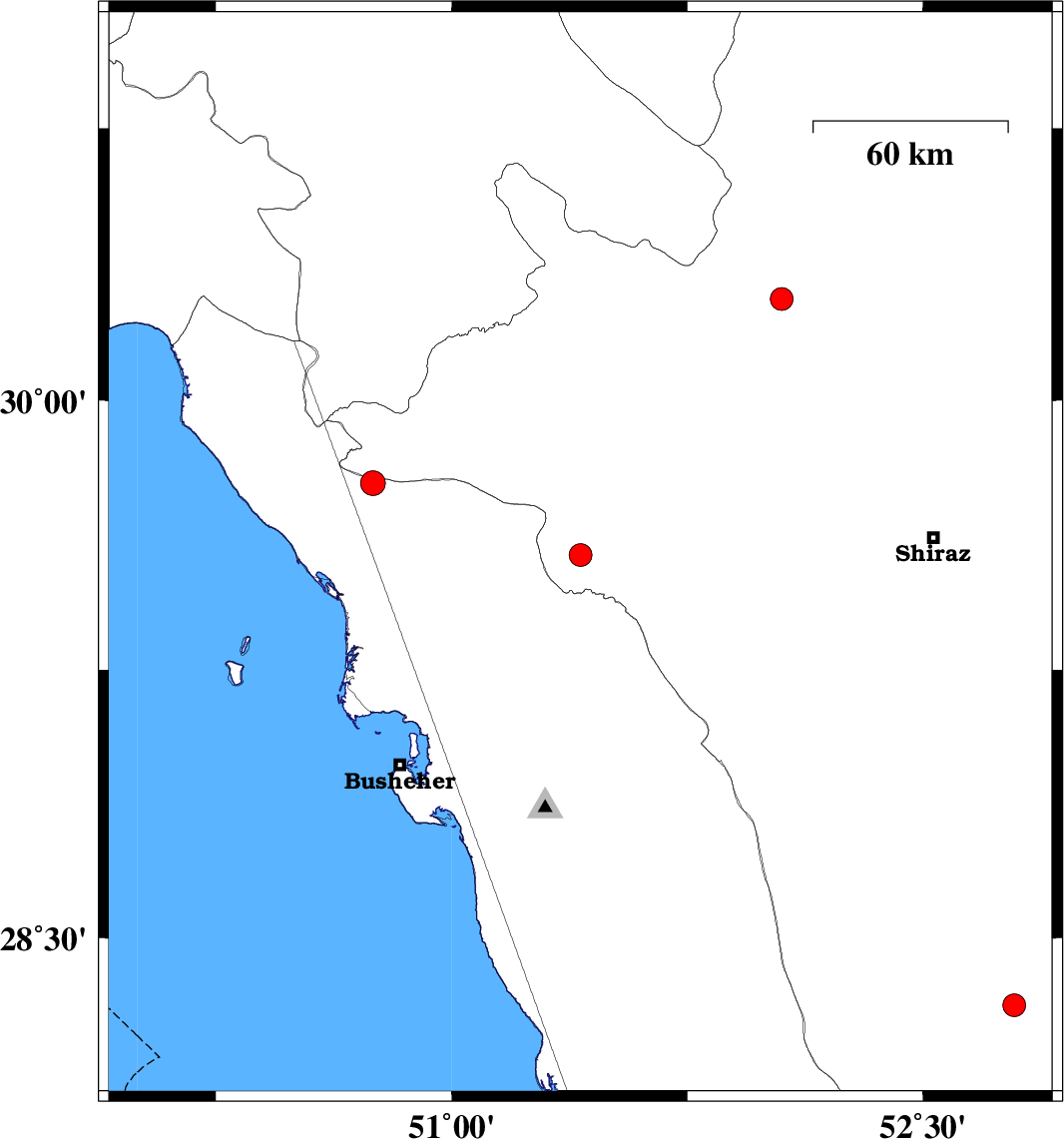 | 2008/06/01 | 05:05:56.4 | 09:35:56.4 | 29.77 | 50.75 | 12 | ML:3.5 | 31 km North-East of Bandar-e genaveh, Bushehr Province | ||