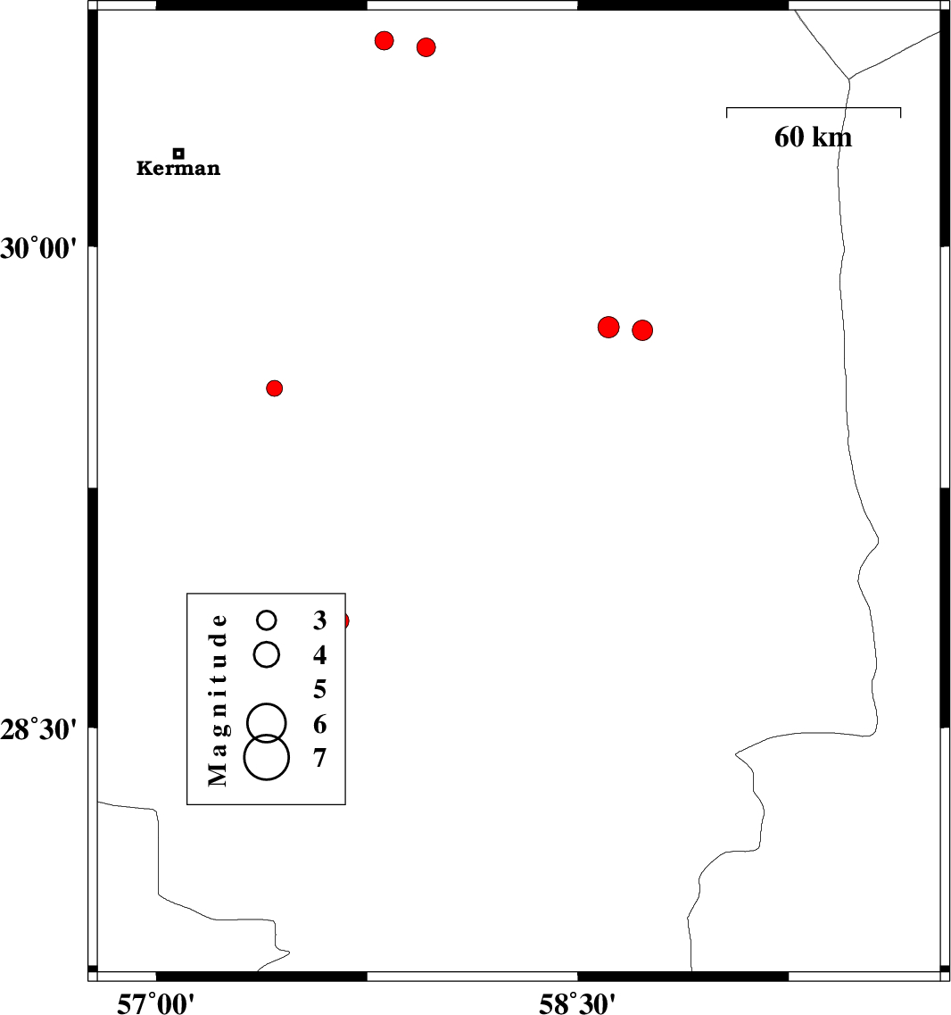 | 2008/05/21 | 00:59:49.9 | 05:29:49.9 | 30.1 | 57.64 | 14 | ML:3 | 57 km South-East of Kerman, Kerman Province |