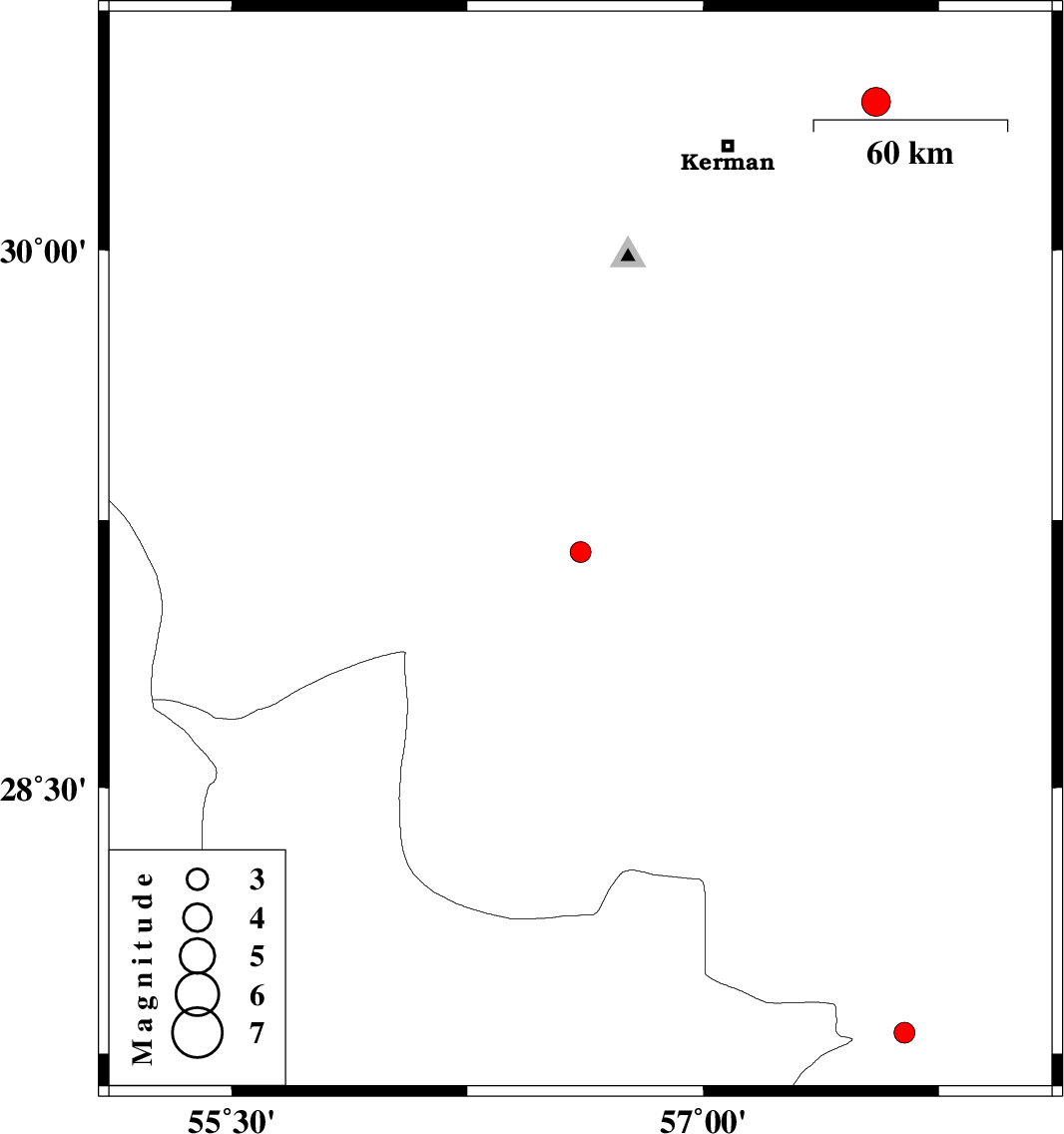 | 2008/06/24 | 02:01:25.7 | 06:31:25.7 | 27.81 | 57.64 | 16 | ML:3 | 16 km South of Kahnuj, Kerman Province | ||