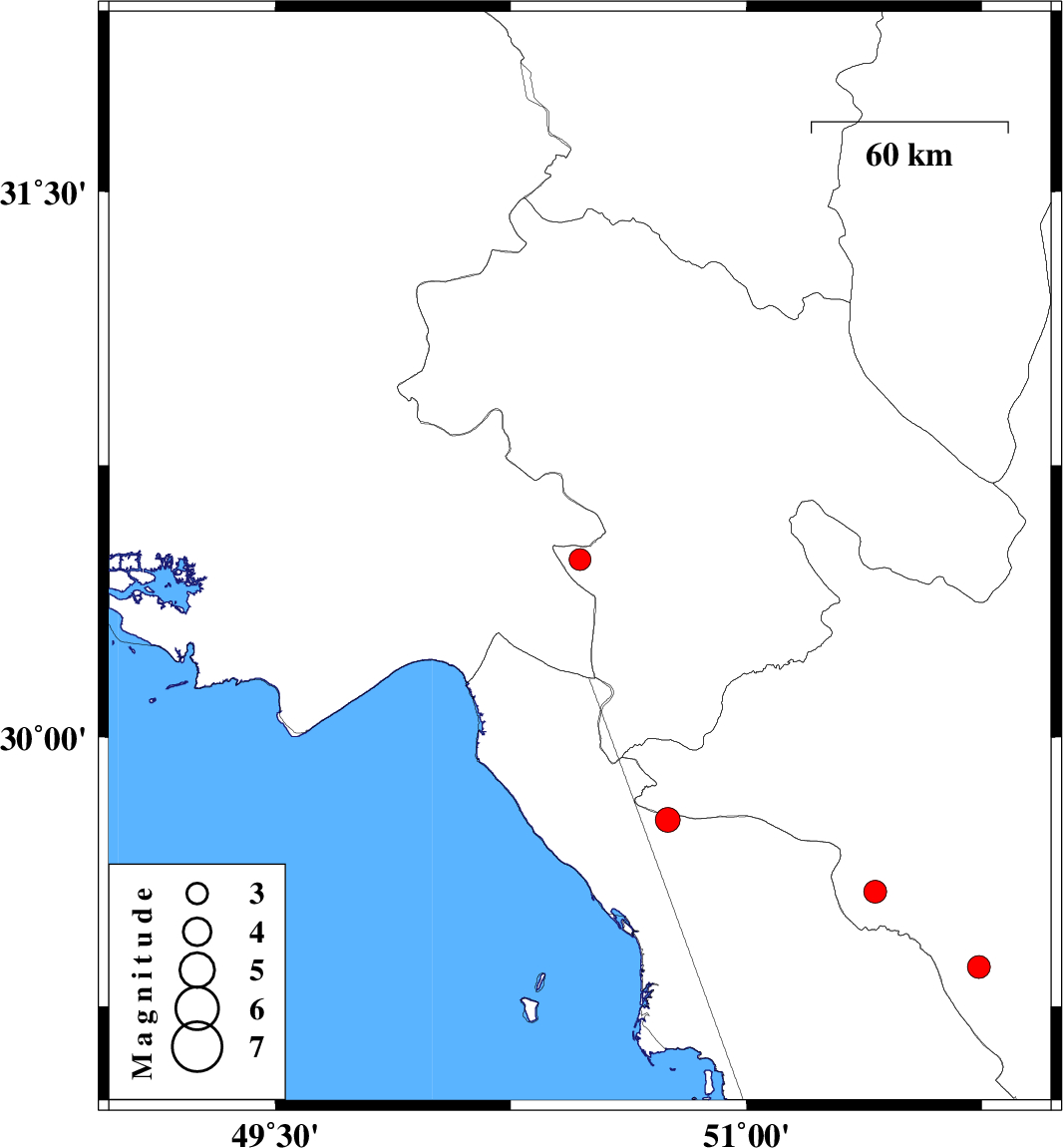 | 2008/06/01 | 05:05:56.4 | 09:35:56.4 | 29.77 | 50.75 | 12 | ML:3.5 | 31 km North-East of Bandar-e genaveh, Bushehr Province |