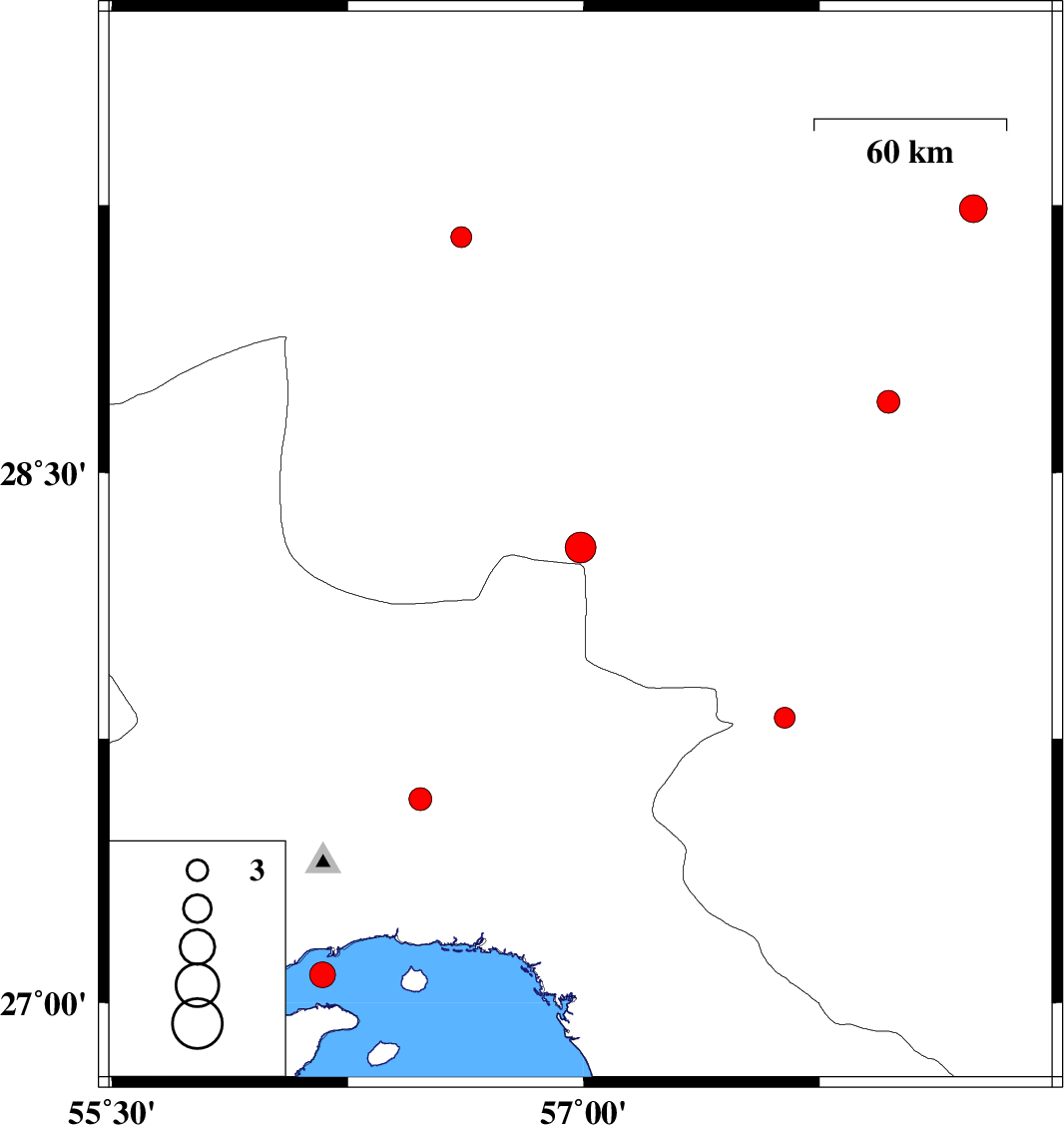 | 2008/06/23 | 22:16:14.6 | 02:46:14.6 | 27.58 | 56.48 | 14 | ML:3.3 | 48 km North-East of Bandar-e abbas, Hormozgan Province | ||