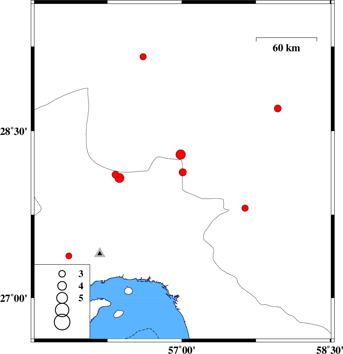 | 2008/06/24 | 02:01:25.7 | 06:31:25.7 | 27.81 | 57.64 | 16 | ML:3 | 16 km South of Kahnuj, Kerman Province |