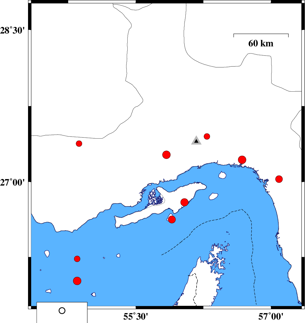 | 2008/08/04 | 09:08:45.7 | 13:38:45.7 | 26.65 | 54.79 | 15 | ML:3.9 | 14 km North of Bandar-e lengeh, Hormozgan Province | ||