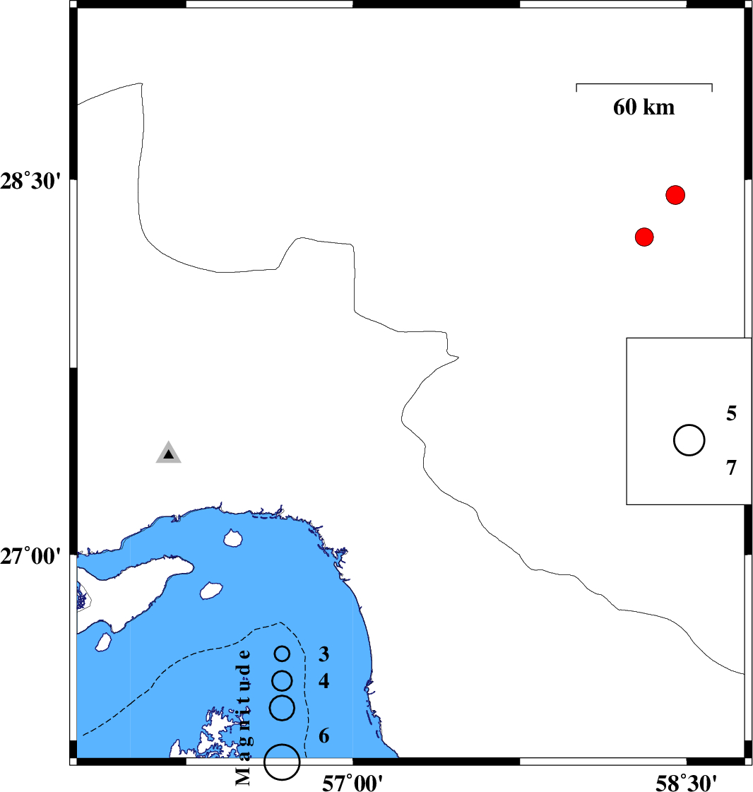 | 2008/08/20 | 15:20:35.2 | 19:50:35.2 | 28.04 | 57.71 | 15 | ML:3.6 | 10 km Kahnuj, Kerman Province |