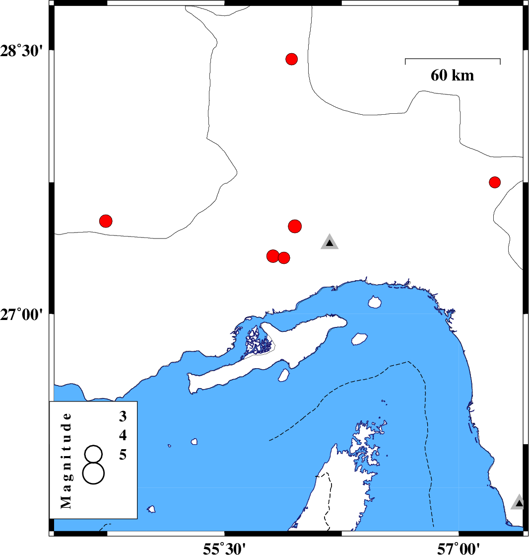 | 2008/08/27 | 20:20:18.8 | 00:50:18.8 | 27.25 | 55.91 | 5 | ML:3.4 | 37 km West of Bandar-e abbas, Hormozgan Province | ||