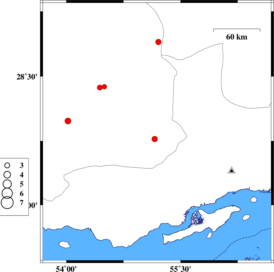 | 2008/08/25 | 12:16:39.2 | 16:46:39.2 | 27.46 | 54.77 | 38 | ML:3.7 | 48 km South-East of Lar, Fars Province |