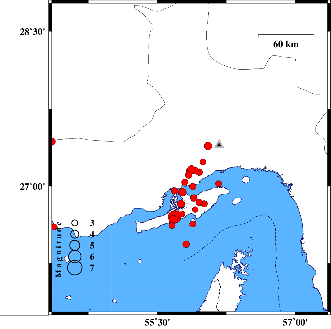 2008/09/10 19:03:15.5 23:33:15.5 27.0455.913 ML:3.3 36 km West of Qeshm, Hormozgan Province