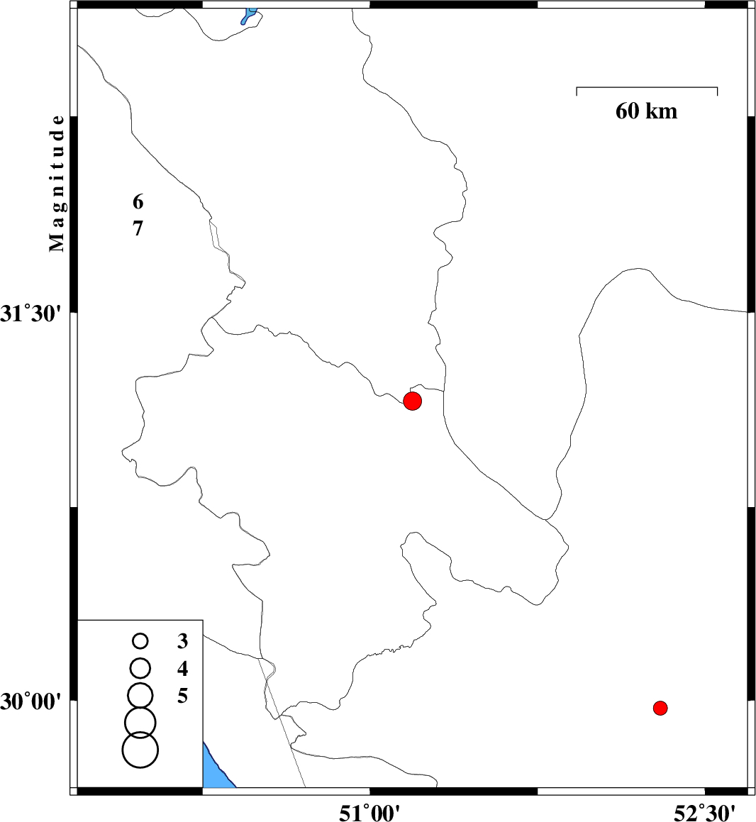 | 2008/10/04 | 15:28:13.2 | 18:58:13.2 | 29.97 | 52.3 | 14 | ML:2.8 | 44 km South-East of Ardakan, Fars Province |