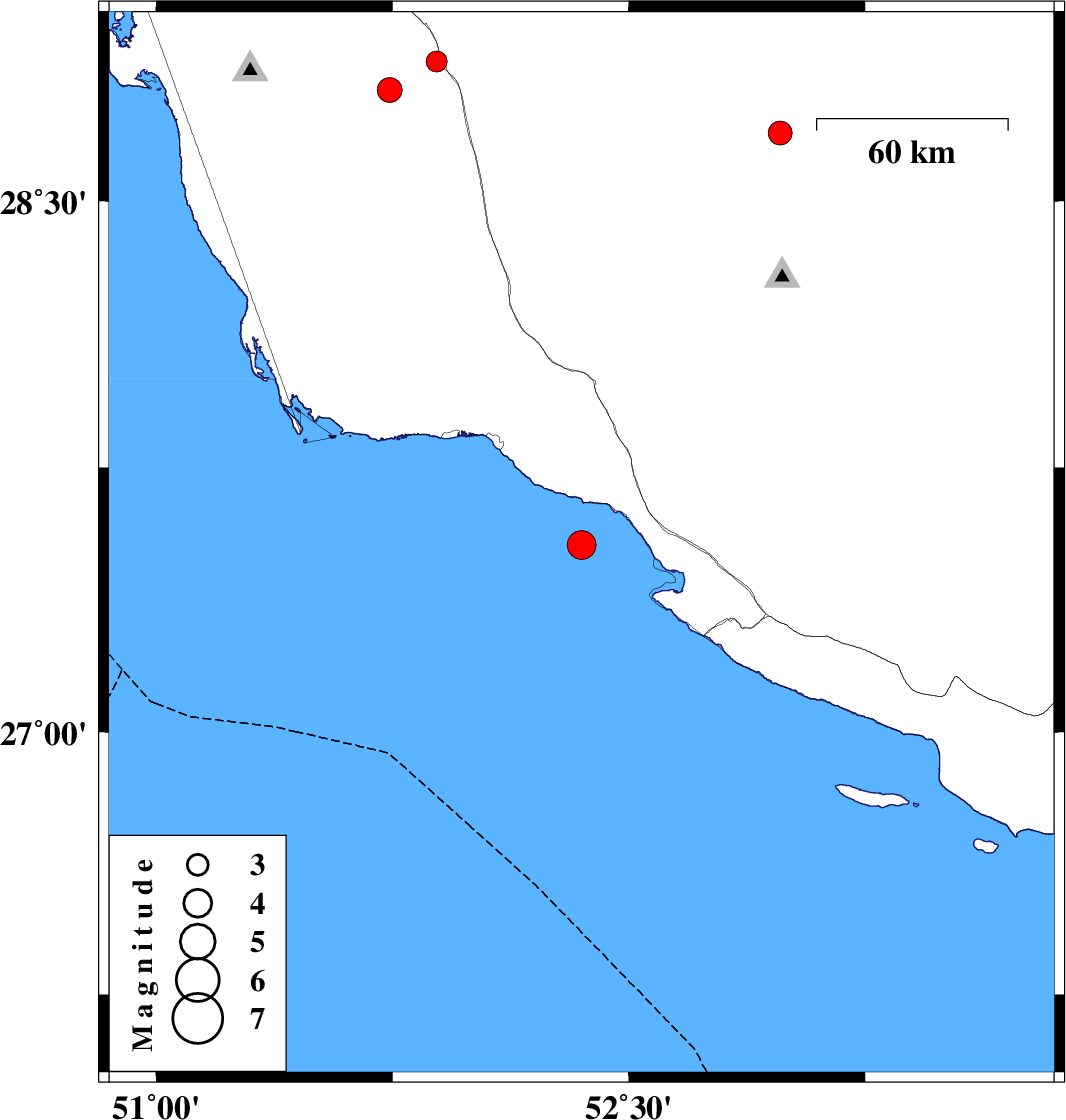 | 2008/11/11 | 13:51:01.1 | 17:21:01.1 | 27.53 | 52.35 | 15 | ML:4.1 | Persian Gulf, 34 km South of Jam | ||