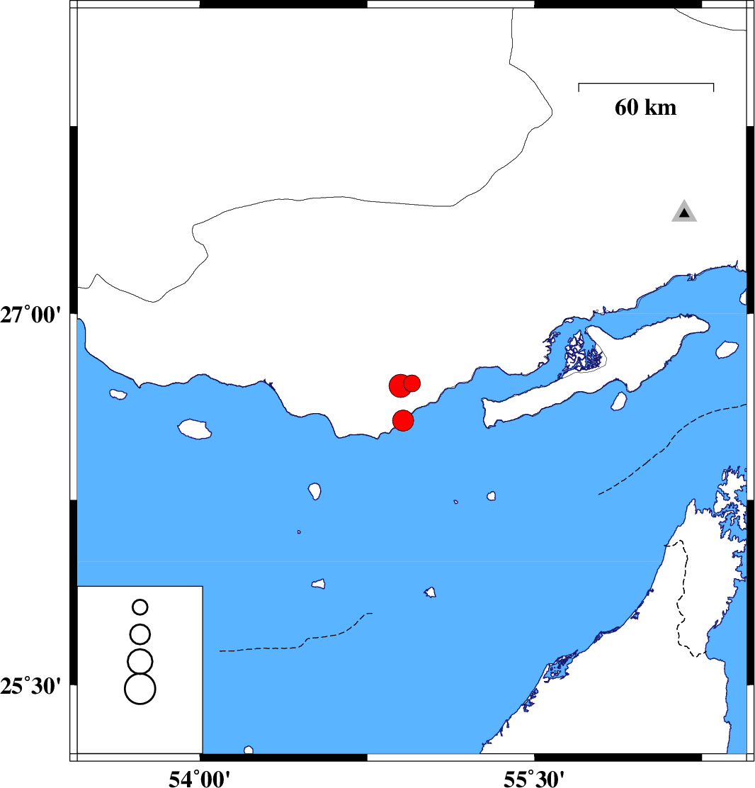 | 2008/11/05 | 02:22:17.8 | 05:52:17.8 | 26.57 | 54.91 | 14 | ML:4.2 | 7 km Bandar-e lengeh, Hormozgan Province |