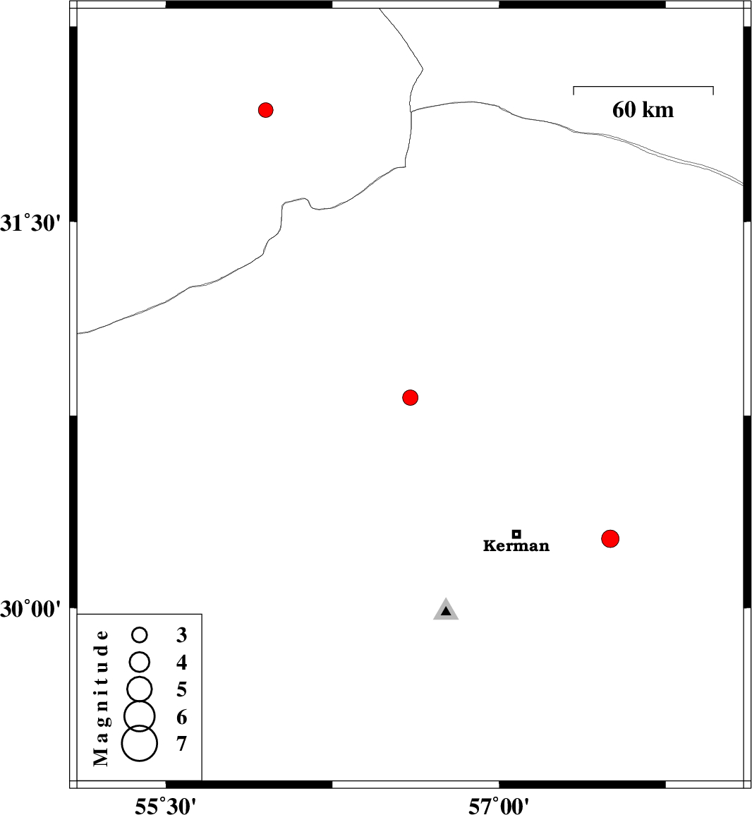 | 2008/11/20 | 04:14:59.2 | 07:44:59.2 | 31.93 | 55.95 | 15 | ML:3 | 63 km North-East of Bafq, Yazd Province |