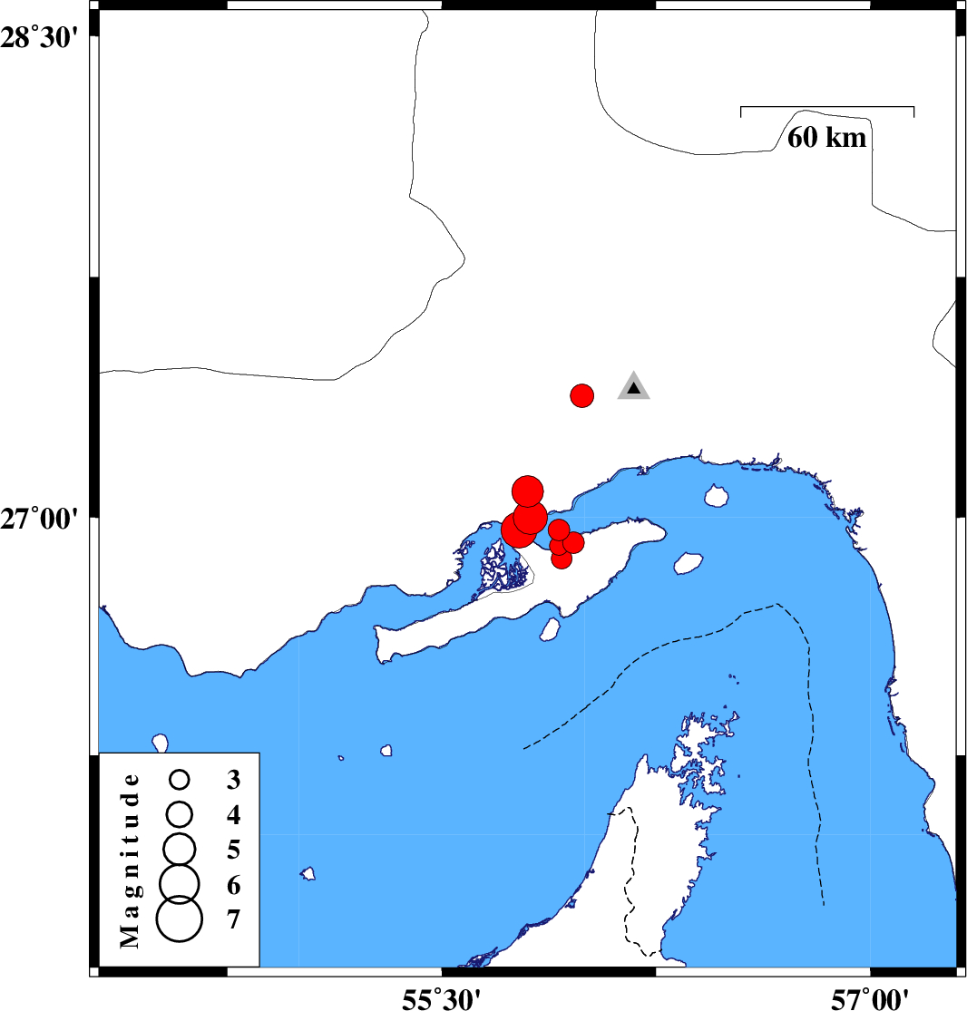 | 2008/12/07 | 13:36:20.8 | 17:06:20.8 | 26.96 | 55.77 | 11 | Mb:5.6 | Persian Gulf, 49 km West of Qeshm |