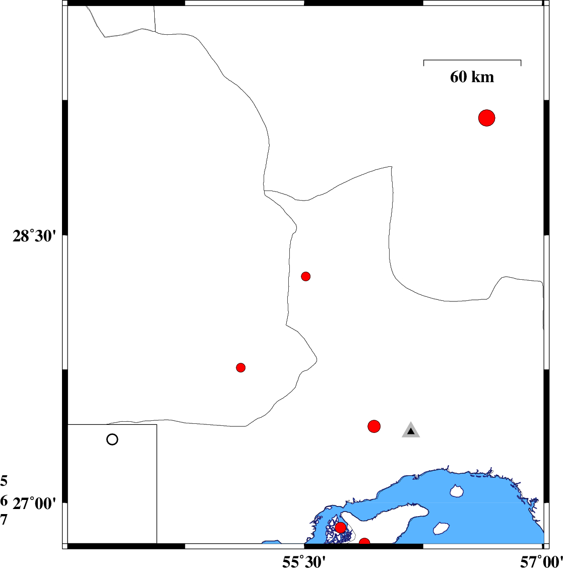 | 2008/12/27 | 22:58:43.9 | 02:28:43.9 | 26.86 | 55.73 | 15 | ML:3.1 | Persian Gulf, 53 km West of Qeshm | ||