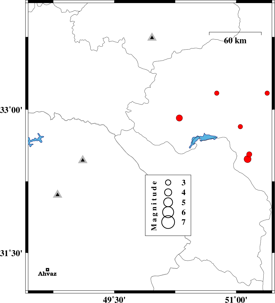 | 2009/01/07 | 01:19:01.3 | 04:49:01.3 | 31.91 | 49.7 | 45 | ML:4 | 17 km West of Izeh, Khoozestan Province | ||