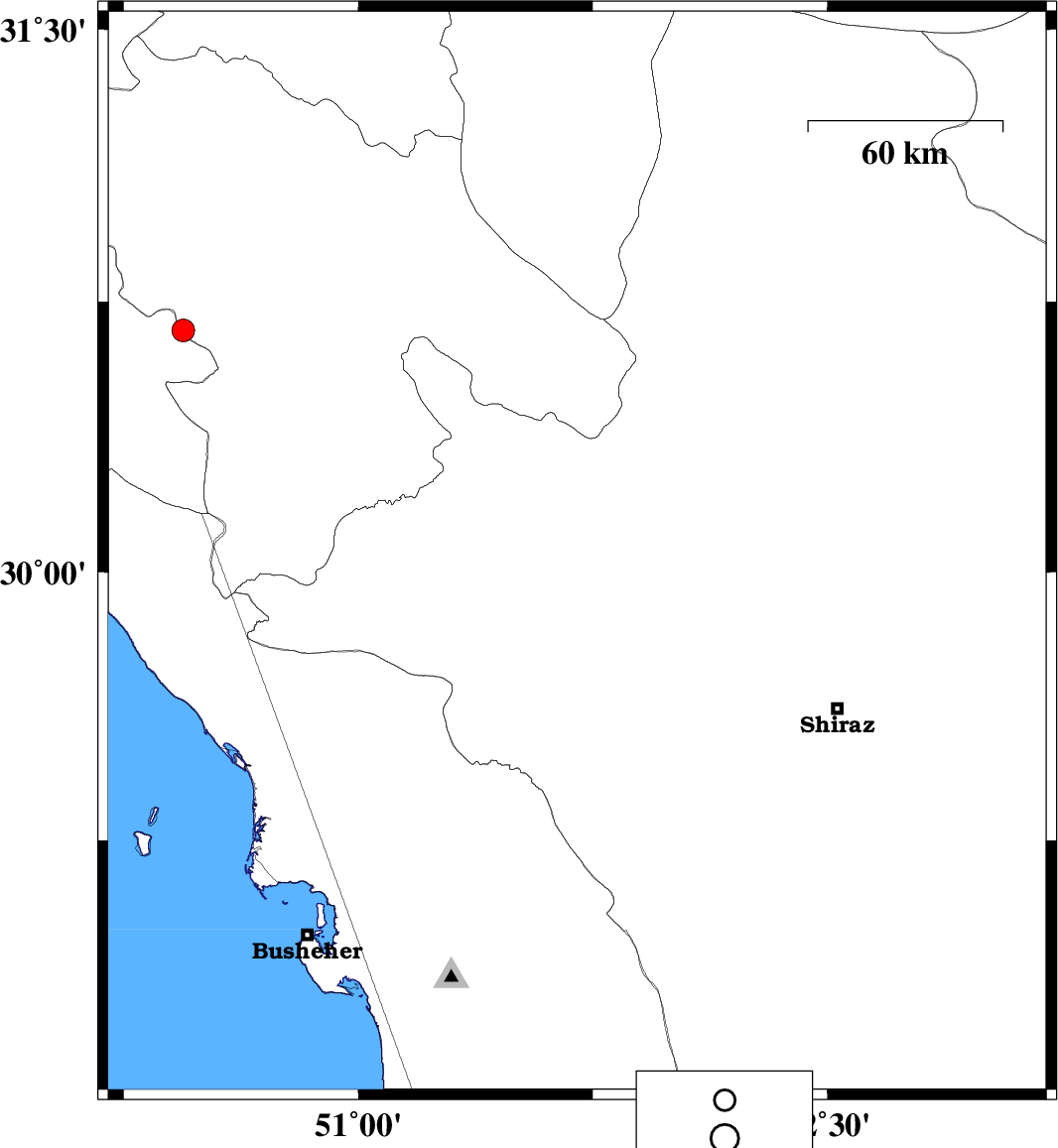| 2009/01/29 | 23:50:32.3 | 03:20:32.3 | 29.38 | 51.82 | 18 | ML:3 | 31 km South-East of Kazerun, Fars Province | ||